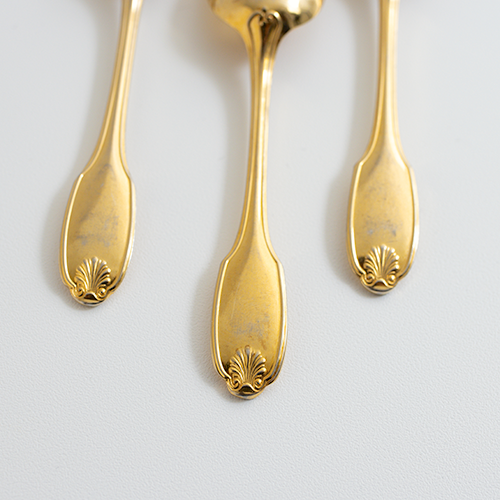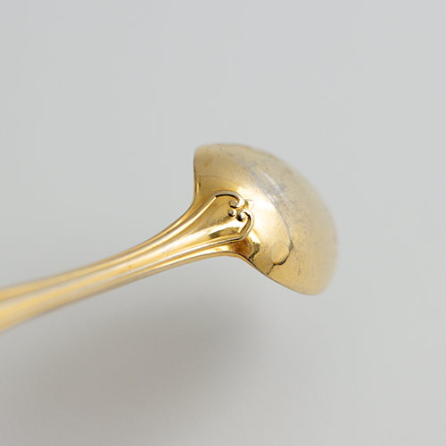 金メッキが施されたデミタスサイズと呼ばれる小さめのスプーンになります。小ぶりなカフェカップやモカカップに添えるのに丁度良いサイズ感です。ルイ14世が愛した貝殻のモチーフ『Vendôme Coquille(ヴァンドーム コキーユ)』はブランドの初期から存在するクラシックなシリーズとして知られています。