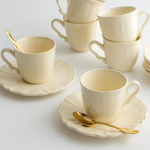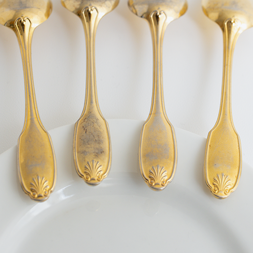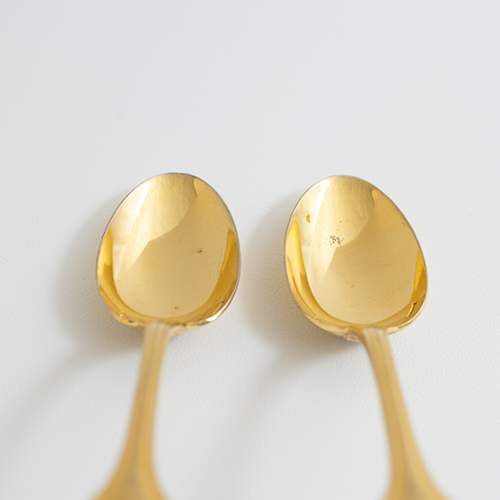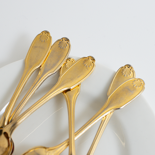金メッキが施されたデミタスサイズと呼ばれる小さめのスプーンになります。小ぶりなカフェカップやモカカップに添えるのに丁度良いサイズ感です。ルイ14世が愛した貝殻のモチーフ『Vendôme Coquille(ヴァンドーム コキーユ)』はブランドの初期から存在するクラシックなシリーズとして知られています。