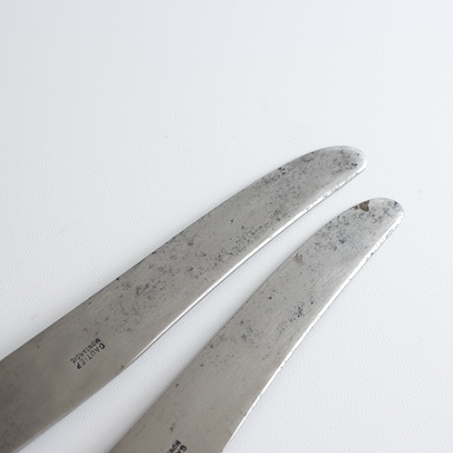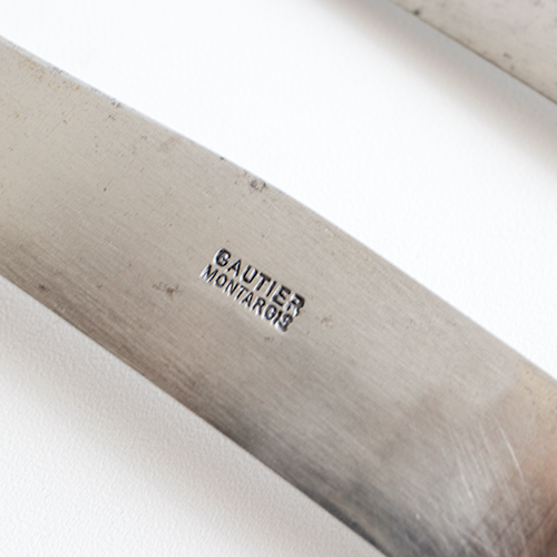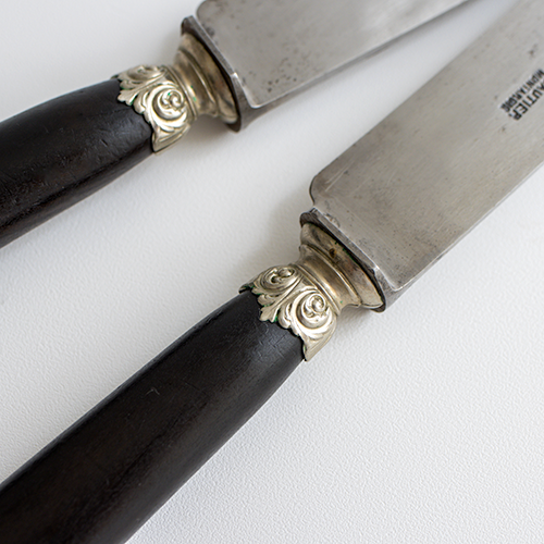 GAUTIER MONTARGIS_フランス中部ロワレ県の都市モンタルジのメーカー”GAUTIER”。19世紀後期〜20世紀初期にかけて製作された黒檀ナイフです。ブレードは鋼、ハンドルは黒檀、ハンドルとブレードを繋ぐCollar(襟)のシルバー装飾が美しいテーブルナイフです。ブレードは経年による黒ズミが見られます。天然素材の黒檀はわずかに亀裂が見られますが、目立ったダメージもなく状態は良好です。