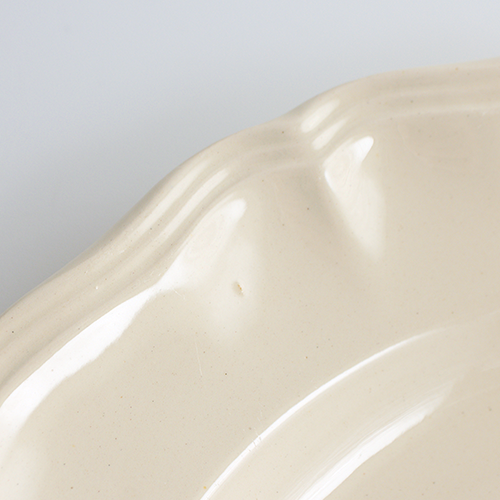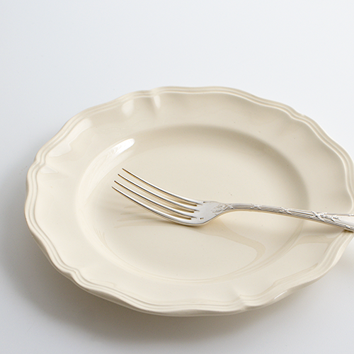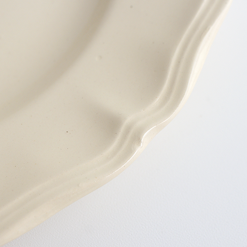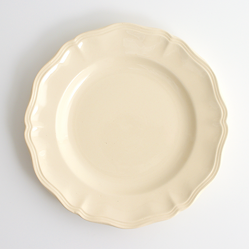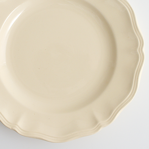 優しい温かみのあるエクリュカラーに、花リムの縁取りが愛らしいサルグミンヌの定番プレート。飽きのこないシンプルなデザインで、どんなシーンにもすっと馴染むおすすめの一枚です。ヒビカケなし。使用感やカトラリー跡もほとんど見られず、デッドストックのような綺麗なお品になります。