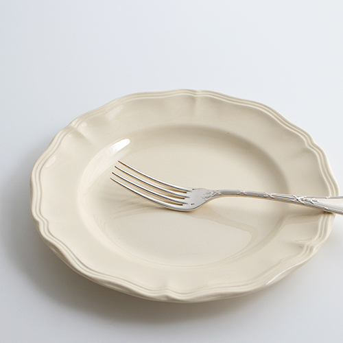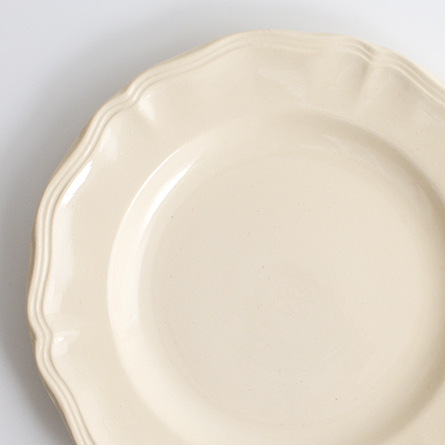 優しい温かみのあるエクリュカラーに、花リムの縁取りが愛らしいサルグミンヌの定番プレート。飽きのこないシンプルなデザインで、どんなシーンにもすっと馴染むおすすめの一枚です。ヒビカケなし。使用感やカトラリー跡もほとんど見られず、デッドストックのような綺麗なお品になります。