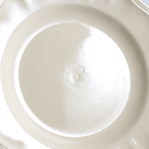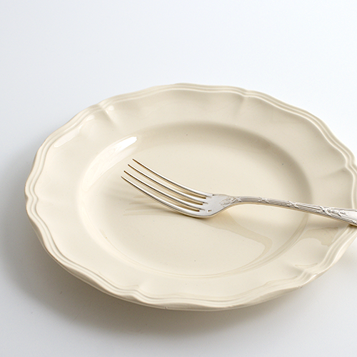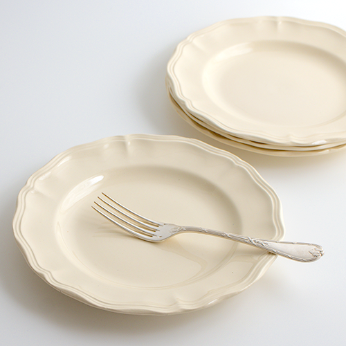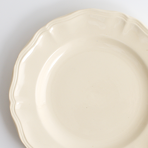 優しい温かみのあるエクリュカラーに、花リムの縁取りが愛らしいサルグミンヌの定番プレート。飽きのこないシンプルなデザインで、どんなシーンにもすっと馴染むおすすめの一枚です。ヒビカケなし。使用感やカトラリー跡もほとんど見られず、デッドストックのような綺麗なお品になります。